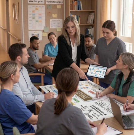 Veränderung entsteht im Alltag, nicht nur im Seminarraum. Deshalb begleitet CareKonzept Teams auf Wunsch auch nach Fortbildungen oder beim Aufbau des Sozialdienstes weiter vor Ort, damit neue Strukturen nicht im Ordner verschwinden, sondern gelebt werden.